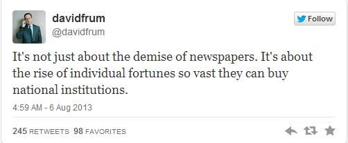 Jeff Bezos对华盛顿邮报的私人收购更加证实了大众传媒行业的一个趋势——这个行业正在回归早期的寡头模式,如果有人能摸索出一个符合数字化时代情境的寡头模式的话,这个人或许就是Jeff Bezos了。