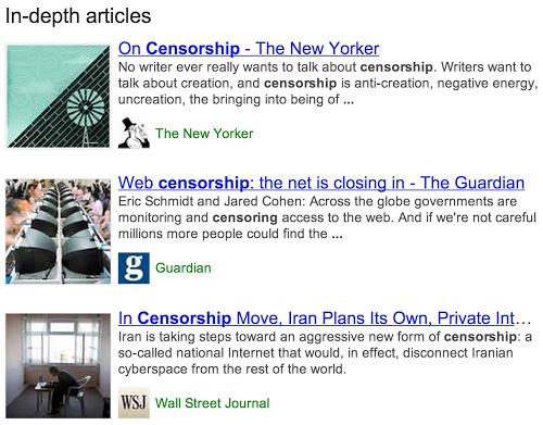 Google今天宣布了一项搜索新功能——在返回结果中新增“深度文章”部分,帮助用户更好地理解他所搜索的话题。如下图所示,现在你在英文地区的Google中搜索“censorship”的话,Google会在返回结果中给出来自《纽约客》、《卫报》以及《华尔街日报》等老牌纸媒的深度文章链接。如果你搜索“lego”,则会发现从性别到艺术到工程等不同话题的深度文章。