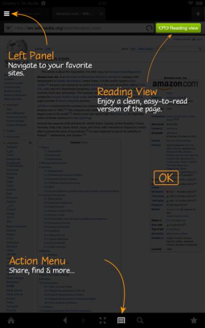 首先,用户界面发生了比较大的变化,同时导航栏也被重新设计了一番,并增加了更简洁的标签页面,能让用户快速访问常用网站。Kindle Fire社区也被并入至屏幕左侧的菜单栏。同时整个控制面板也进行了设计改良,用户可以通过绿色的“阅读模式”按钮获得更好的阅读体验。