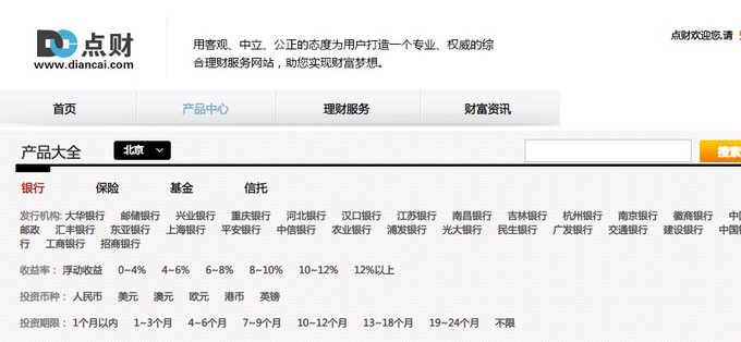 目前版本的点财网架构类似大众点评。理财产品包括银行、保险、基金、信托、P2P五类近万余种理财产品。用户可以按照投资比重、投资期限、期望收益率、用户好评度选择自己感兴趣的理财产品,同时还可以在每种产品主页进行点评。