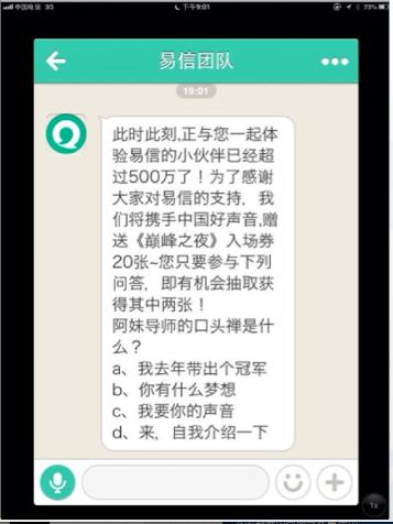 "易信"自8月19日早上召开发布会,截止目前,其用户数量已经达到500万。今天,易信团队在易信应用中公布了这一消息。