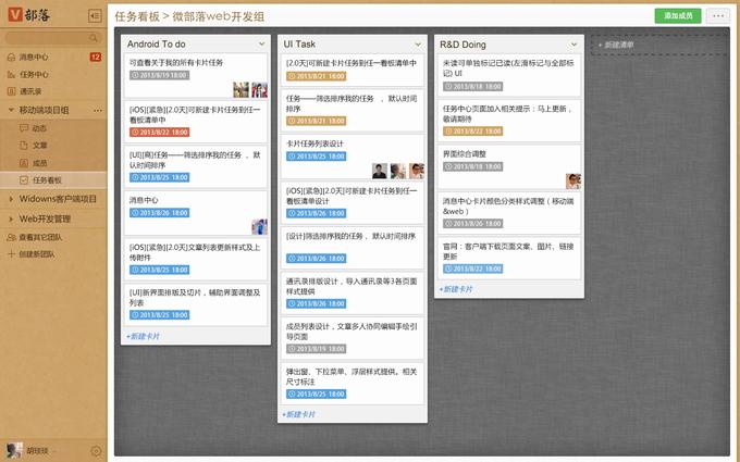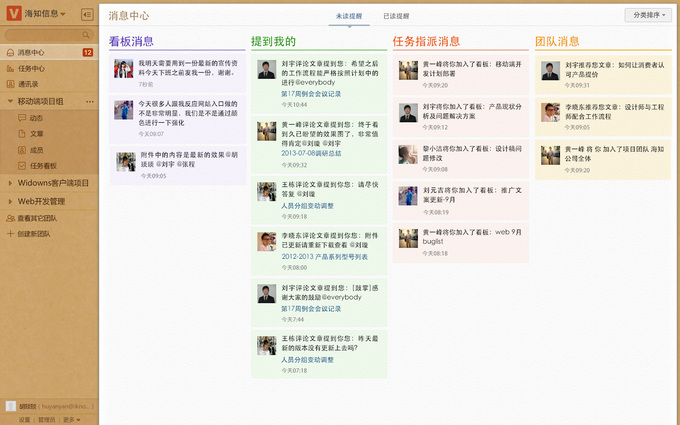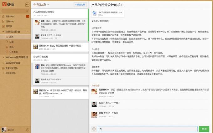 在改版之前,V部落最核心的功能是通过文章、文章评论做团队的沟通和知识沉淀,当时文章和团队(小组)分得较开,而新版本相当于在保证“透明”的前提下,将知识管理连同任务、项目管理内化在不同的项目团队上。可以看到,新的V部落呈现给用户的,不再像Yammer,而是类似笔记应用的三栏结构设计,主要由两部分构成——一是与用户行为、所在团队相关的消息中心和与用户to-do相关的任务中心;二是以项目团队为核心的项目管理,包括内化了的动态(信息流)、文章(知识管理、文档协同)、成员以及任务看板(任务管理)。