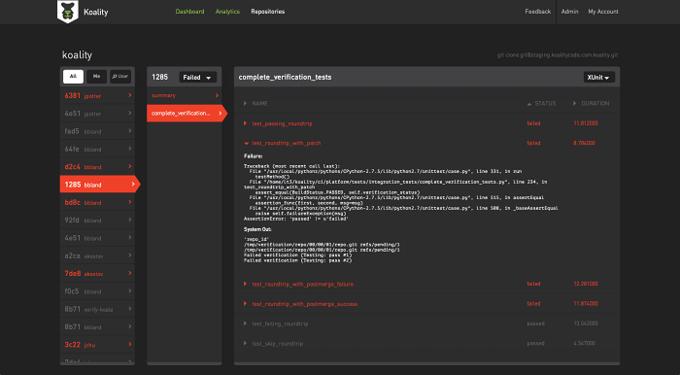 Koality支持Git或Mercurial的版本管理方式,可运行在Unix-like系统上。Koality会在开发者提交新代码后先做云端测试,测试通过后才自动合并到项目主要分支中,当有代码没通过测试开发者会收到提醒。这样一来,Koality的服务可以让开发者专心开发,而不用在开发和测试之间不断切换而影响效率。另外,Koality说开发者不用担心代码安全,测试是可以跑在自己服务器上的(也支持AWS),它不会将代码传出防火墙之外。