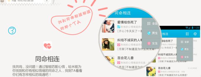 在哈米上,你可以发起问题,比如该不该分手,该不该异地恋,该不该出柜,让大众给你支支招。你也可以直接发表心情状态,点击“同命相连”,找一个跟你境况相同的陌生人好好聊聊。比起那些站着说话不腰疼的心理专家,或许相同地境况会让你更愿意敞开心扉。哈米创始人温飞郁告诉我,从2012年5月创业至今,通过互联网爬虫,哈米的情感字符库已经积累将近10万,能够较准确的做智能匹配。