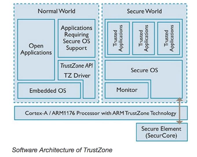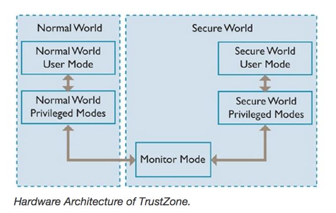 TrustZone系统通过完全分割硬件和软件资源以保证安全性,这两者被分别安置在Secure区和Normal区 – 前者为安全子系统而设,后者则是处理其它任务的正常区域。AMBA3 AXI总线保证Normal区的组件无法访问Secure区的资源,以此方式在两区之间建立区一道坚固的墙来杜绝对储存在Secure区的敏感资源做出的潜在攻击。