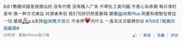 8点1氪晚间版是我提出的 没有代笔 没有植入广告 不牵扯工资问题 不是心血来潮 每日准时发布 换一种方式表达 对读者来说 我们写的仍然是新闻 谢谢@36氪Plus 用爱和理智包容这一切 感恩 p.s支持 @36氪开放日 不会停 内什么 一直关注互联网创业。