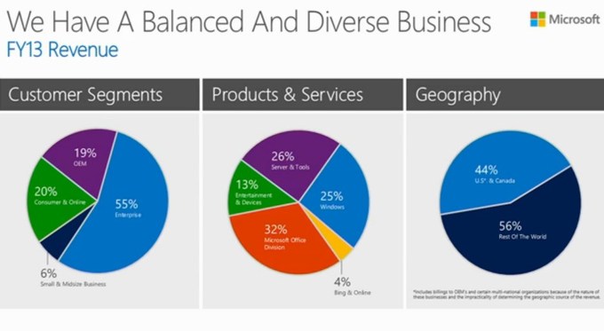 第三图是收入的地理分布情况。56%收入由北美以外市场贡献。这个比例可能还会进一步扩大,微软COO在会上提到,中国是该公司发展最快的市场。