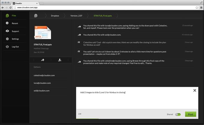 CloudOn的产品副总裁Jay Zaveri表示:“如今,用户每天通过邮件发送的文件数超过10亿份,每个用户每周平均会花100分钟的时间去翻查过去的邮件。我们非常关注用户分享文件这一行为,网页版CloudOn的推出不仅可以让用户在更多的平台上使用CloudOn的服务,同时也可以帮助用户更便捷的分享和编辑文件。”