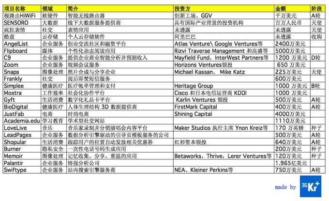 2.大数据、企业服务、在线教育、在线医疗是最受风险投资机构青睐的几个主要领域;获得巨额投资的C9和Palantir是两个典型的利用大数据为企业和政府提供服务的公司;其他如Angellist、Zoom、Moxtra也都专注于服务企业,比如帮助企业在线融资、给企业提供更流畅廉价的在线视频会议平台、帮助企业提升项目协作效率等。