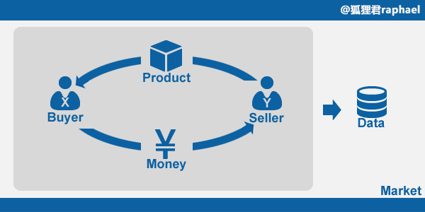 在此不得不夸一下阿里——它的商业模型超级完整。电商其实就是卖买东西,当中涉及到的要素有:市场本身、买卖双方、产品、数据和钱。我们看看下面这张图: