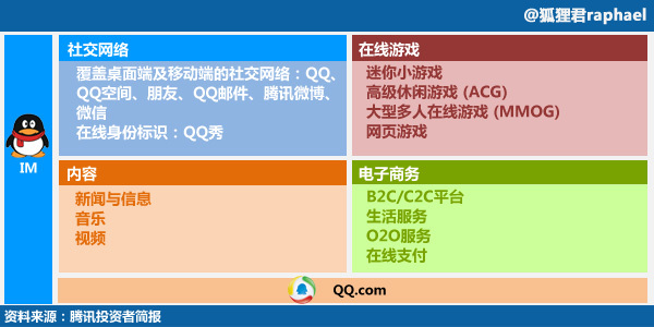 我们回头再看看腾讯的使命——“通过互联网服务提升人类生活品质”。它还有句详细解释:“使产品和服务像水和电一样源源不断融入人们的生活,为人们带来便捷和愉悦。”简单来说就是:什么可以让你们爽,我就做什么。由这个使命衍生出来的腾讯的产品,涵盖了社交网络、在线游戏、内容以及电商。