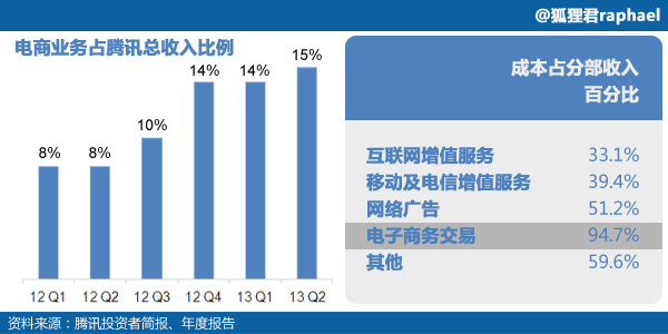 自2012年第一季度起,由于完成了对易迅的控股后投入的5亿元大促,电子商务占腾讯收入的比例由8%跃升至2013年第二季度的15%,但电商的利润率相当低。2012年腾讯电商交易成本达42亿,占电商总收入的94.7%。也就是说电商业务每赚1块钱,腾讯就要付出9毛5的成本。而互联网增值服务的成本只占其收入的33.1%。孰轻孰重,小马哥自然心里有数。因此,电商业务并不能成为腾讯重视互联网金融的理由。