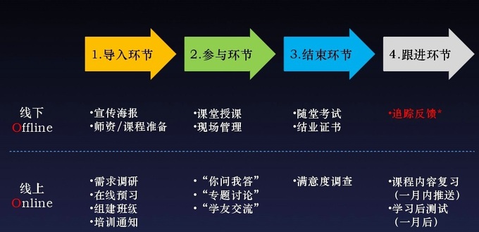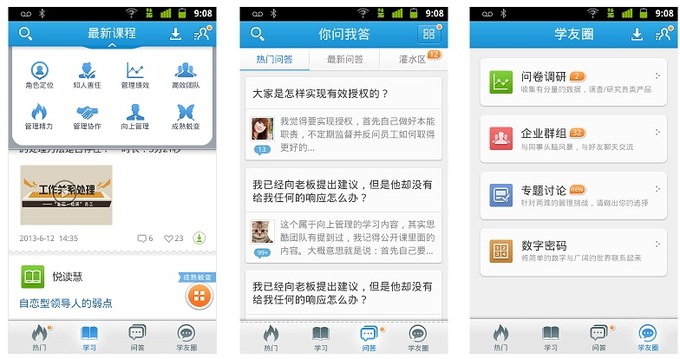 思酷目前已推出了经理荟(iOS/Android/WP)和销售宝(iOS/Android/WP)两款移动教育应用,分别面向企业中基层管理者和销售人员提供职场教育。产品主要服务于凯洛格现有客户体系,试图通过分类微课程、问答社区、学员IM群组等功能的整合,塑造线上加线下的混合企业教育模式。每一个培训项目都由导入、参与、结束、跟进四个环节构成,各环节均可形成线上线下联动。比如传统的面授培训很难跟进培训后的应用和效果,而依靠手机App则可以简单实现。
