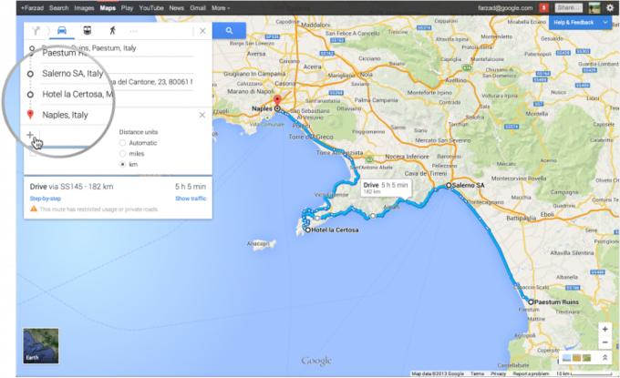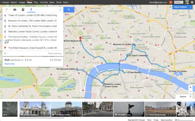 Google方面称,事实证明,多地点导航是用户十分喜爱的其中一个功能。无论是在驾车、走路还是公交等路径类型上,用户现在都可以只设起点,然后通过“+”按钮,添加一个一个感兴趣的目的地,最终形成一条完整路径。另外,搜索框输入、直接点击地图等方式同样能添加中间节点。而所有路径节点除了在地图上显示外,其Google街景还将显示在最下排。这对于旅行的用户非常方便。