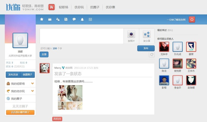 在线上部分,优你采用了SNS的架构,并在SNS之外独立设置了找兼职、线下活动、圈子、生活团购等版块。虽然冠以SNS之名,但其运行机制却不是围绕社交展开:网站以“找兼职”为核心诉求,以兼职版块作为用户交互冲动的触媒,其他一切功能都由此衍生开去。而线下活动、生活团购也部分充当了会员沉淀资金(会员需预充值一定费用以享受兼职中的增值服务)的兑出渠道。用户在各版块的交互信息会投射到SNS环境中,使其在社交机制下得到策展。