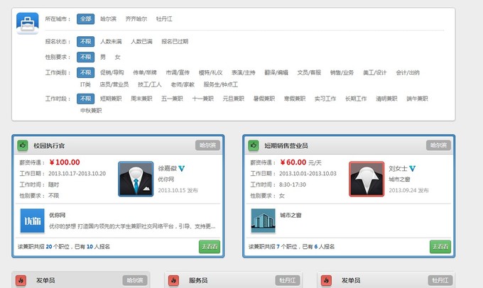 优你团队2011年进入兼职市场,2012年9月网站上线,运营至今已拥有约1.5万网站注册用户和1.7万的付费会员(包括网站上线前的积累)。目前合作企业1000多,其中连锁型企业的订单量占到80%。基于O2O的特点,优你在地域扩张上不可能太快,至今仅覆盖到哈尔滨等三个城市。不过据优你团队表示,其项目经营两年来已累积为会员创造过千万兼职收入。以1.7万会员计,平均每个会员从中所得近600元。如果数字确实,这一成绩还是不错的。目前优你收入主要来自团购和活动,部分来自会员资金沉淀,尚未从兼职撮合中直接获利。
