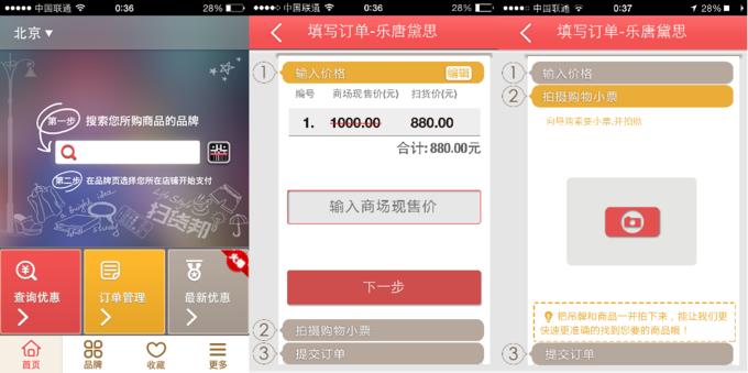 从前端看,扫货邦是一款基于地理位置的商家优惠查询+支付工具。用户可以检索附近的合作商家及其优惠活动,到店体验、下单后用扫货邦拍下商品小票并线上支付。用户借此可享受7到9折的价格优惠,甚至在现场特卖的基础上也能折扣累乘。下单后既可以选择物流隔日送达,商家允许的话也可当场取货(某些店面比较多的品牌由仓库发货更易管理)。