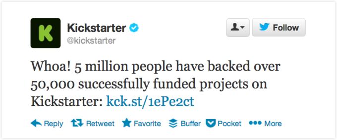 成立于 2009 年 4 月的众筹网站 Kickstarter 的官方推特账号今天宣布:通过其网站顺利完成的众筹项目已经超过 5 万个。