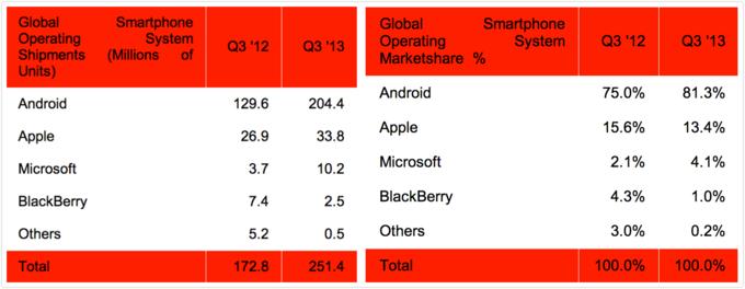Android 市场表现好,Nexus 5 卖的快,Schmidt 当然笑的像如花。据Strategy Analytics 的最新数据显示,今年第三季度全球市场的智能手机出货量达到了 2.514 亿台,与去年同期的 1.728 亿台相比上涨了约 45%。而Android 机型出货量更达到了一个新的高峰,为 2.04 亿台,市场份额高达 81.3%,这比例基本同汉子在互联网公司的占比持平。而Android 得迅速壮大的,很大一部分原因是去年同期占4.3% 的黑莓倒下了,市场份额下降至今年的 1.0%。
