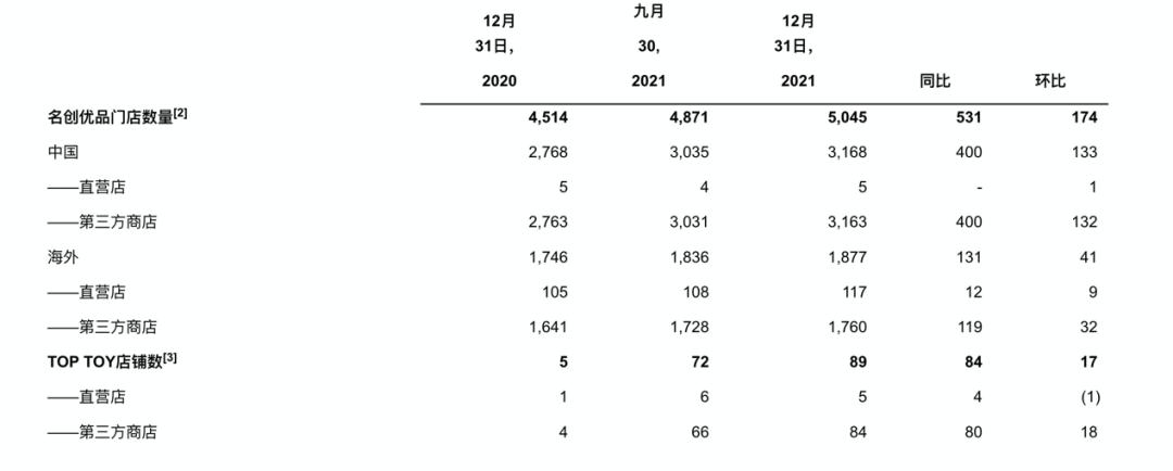 截至 2021 年 12 月 31 日,名创优品门店数量增至5045家,季度净增 174 家门店,2020年同期和上一季度分别净增 184 家和 122 家。