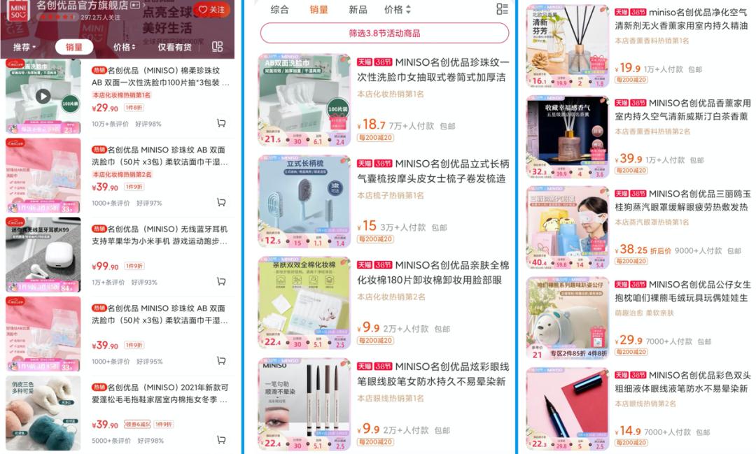 名创在2020年先后开启了天猫、京东的官方旗舰店,随后上线了拼多多。它也是微信小程序中销售额最高的几家之一。已然能稳定贡献超10%营收的线上渠道,不仅成了其生意的基础设施,也是疫情环境下最具确定性的渠道。