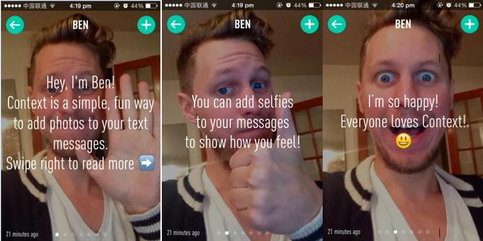 图文的意思就是,Context只允许用户发送写了字的图片,用户先要选择聊天的人,在发送之前需要输入想说的话,接着拍一张照片,人物和风景照都可以。当照片拍完时,系统会自动将图片和文字整合在一起,并将这张图文照片自动发送出去,操作很简单,Context也称自己为“简单有趣的图文交流”。