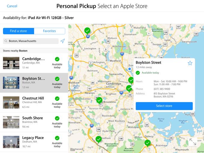 Apple Retail Store 方面和其它两个版本差不太多,但是多亏了额外的屏幕空间, iPad 版商店可以在直接在地图上查看附近的门店。