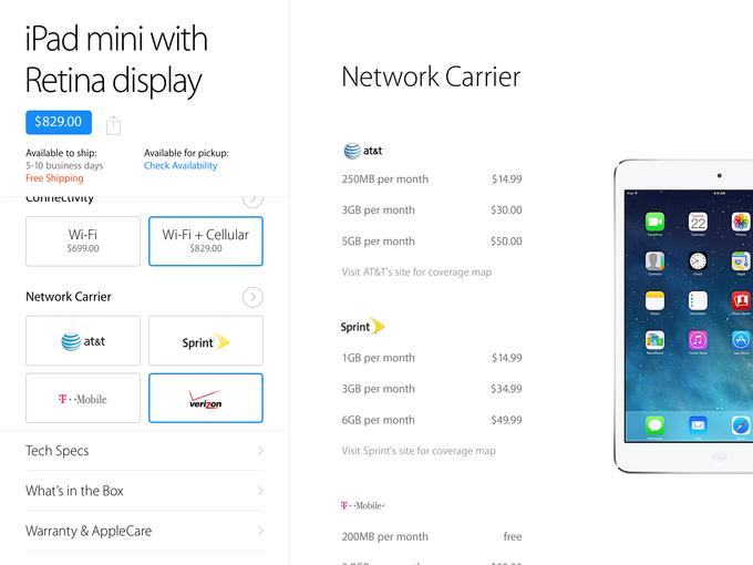 内容呈现方式是另一个 iPad 味浓厚的元素。当你进入一个产品页面时,购买选项如颜色、容量和连接类型,以及技术参数等产品信息会以垂直列表方式出现在屏幕左下方。在其上方是一个固定区域,显示当前所选的产品型号,预计发货日期和 personal pickup 等信息。屏幕的右方是内容呈现的精髓所在,当你点击某个选择时,该区域就会显示相关内容,比如:选择容量时会出现关于容量大小的说明,选择网络运营商时会显示各家的套餐资讯等等。虽然这些内容在 web 版上都有,但是却需要下拉到网页底部进行查看,极易打断购物的流畅体验。而在 iPad 版 Apple Store 上,这些内容被无缝嵌入到了购物流程之内。