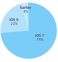 苹果今天发布了 iOS 不同版本的用户数据,iOS 7 在9月份的 iPhone 5s 和 iPhone 5c 发布之后,装机率已经达到了所有苹果移动设备的74%。