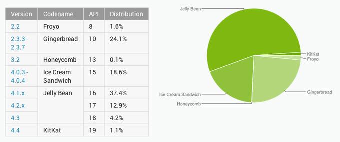 从10月到现在,iOS 7 就增加了近10%的装机份额,这对于一个完全重新设计的 OS 来说,的确很厉害。并且值得一提的是 iOS 6 的市场份额也达到了22%,也就是说苹果这两个最新版本的移动 OS 总共占了96%,而对于 Android 来说,碎片化仍然是个问题(下图)。