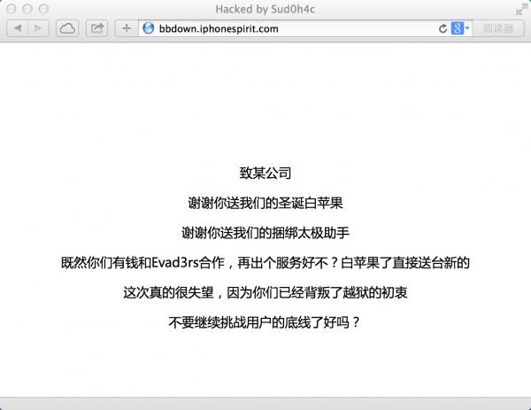这其实也是 Evad3rs 最后决定远程操控移除在中国地区默认安装的“太极助手”的原因,雾霾来得太严重,不采取点措施就会失控。其实关键点还是在于这次越狱技术层明并不完美,用户会遇到白苹果的情况,到最后激起国内黑客直接把太极助手幕后支持网站 iphonespirit.com 给黑了,还留下一些狠话,颇有行侠仗义的感觉。
