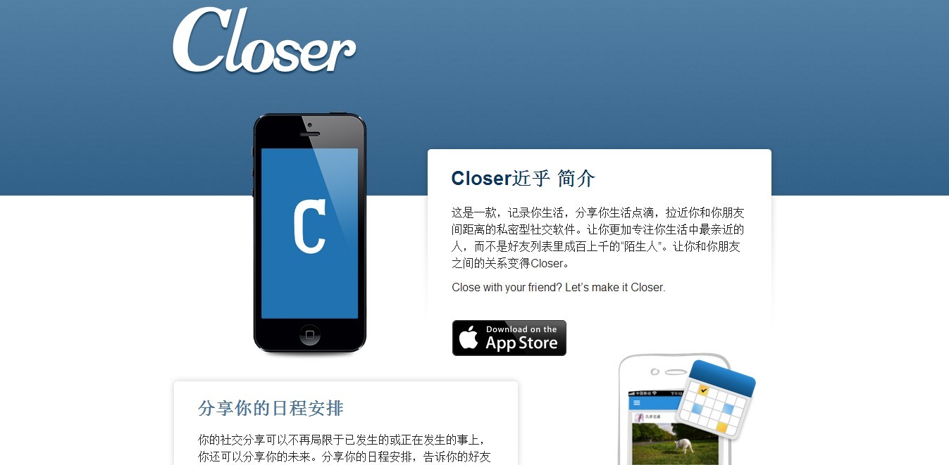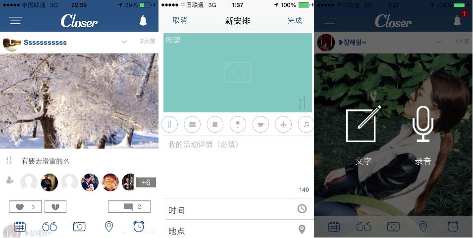 从“日程安排社交网络化”出发,“近乎(Closer)”想在类似Facebook的社交产品范式下,嵌套一些轻度的日程管理元素。通过记录和分享每个人的日常活动和闲暇时间,在朋友之间寻找日程交集,从而引发包括线下交往在内的更紧密的互动。