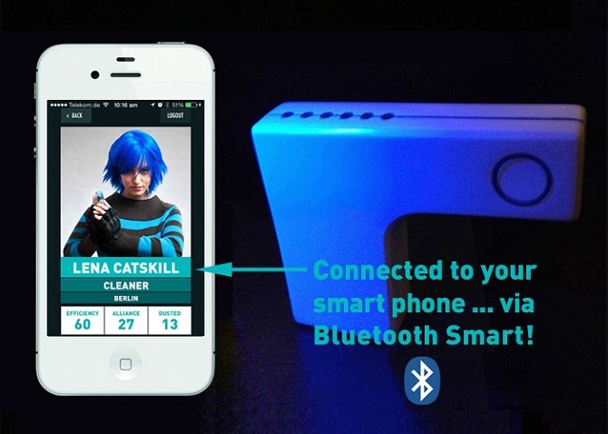 Dustcloud由一把支持蓝牙4.0的手枪和一款app组成。这把枪叫Duster,hold住8秒会自动获得6发子弹(通过LED灯显示),子弹命名为Spek。玩家如果能抢在对方之前开枪,就能凭借发射出的隐形射频信号把敌方的Duster关掉,同时赢得一发Spek,这个玩家也就被干掉了(Dusted),不过13秒后还会重获5发Spek。赢得的积点越多,级别也就越高。