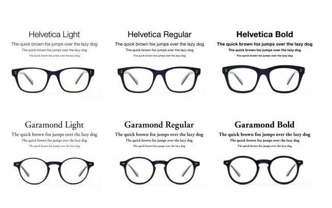 是不是很有创意?据悉,目前Type 只用了两款字体:Helvetica 和 Garamond。每款字体眼镜,当真跟字体一样,有细、正常、和粗大三种“粗细”可选,一共六幅。