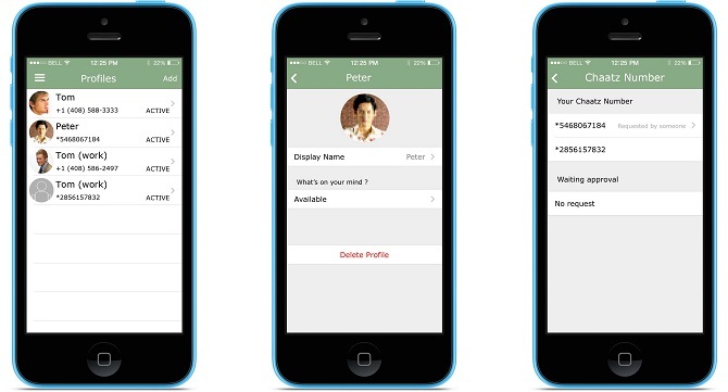 目测Chaatz应该也是一款基于手机通讯录的IM应用。不过用户可以设置不同的头像和身份,针对不同的对象选定不同的头像和身份,但都可以在Chaatz内实现所有对话操作。如果用户不想让某些人知道自己的电话号码,可以将Chaatz生成的看起来像当地电话的一串数字(proxy number)给他,用这个号码你也可以在平板等其它设备上登陆。