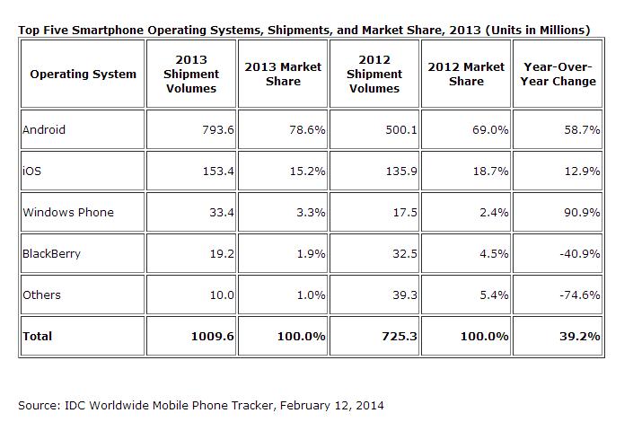 IDC数据:2013年全球智能机出货量首次达10亿,93%份额都被Android和iOS占去
