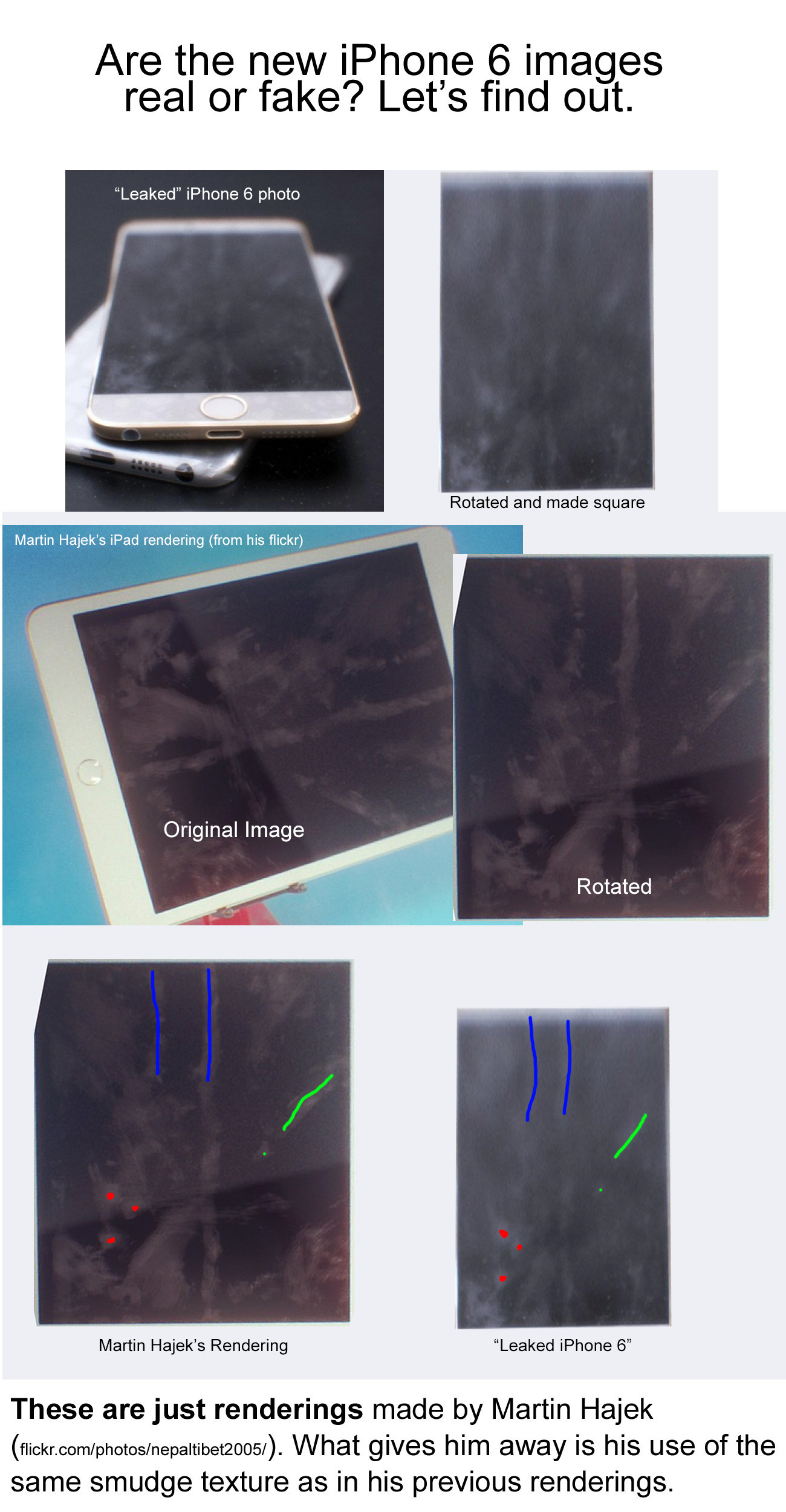 更新:昨天出现在 Twitter 上的 iPhone 6 谍照最后被证实是伪造图片,一篇发表在 Reddit 的文章表示谍照是由 Martin Hajek 制作的 CG 渲染图,从下图中可以看到他在所有样机的图片中均使用了同样的纹理贴图。疯狂的果粉们又可以开始期待 iPhone 6 的真身到底长啥样了。