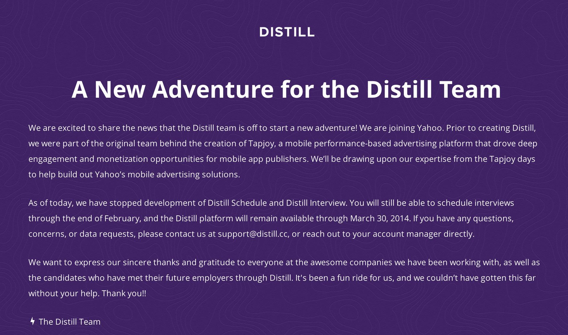 两位创始人中, Deng-Kai Chen 曾在 Tapjoy 以及 Google 负责过移动广告方面的工作,而 Ken Maclnnis 则曾是 StumbleUpon 和雅虎的前员工,负责软件架构工作。在官方网站的声明上,两位创始人已经表示将停止 Distill 相关服务的发展和维护,整个平台将于 2014 年 3 月 30 日彻底关闭,而 Chen 和 Maclnnis 将前往雅虎从事与移动广告解决方案有关的工作。