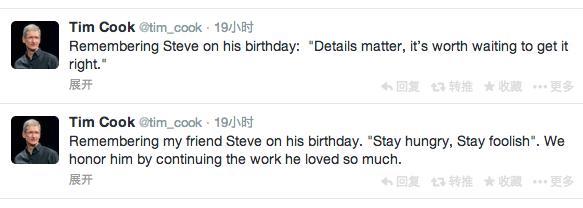 既然赶上乔布斯的诞辰,众多粉丝们也纷纷以自己的方式表达对乔布斯的纪念。例如接档乔布斯的库克同学,很深情的在Twitter上表示,为了纪念史蒂夫,我们将会延续他最喜爱的事业,专注细节,好的产品值得等待。