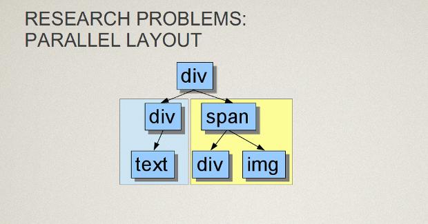 要绘制布局,浏览器需要构建DOM树,并计算各个元素的相对位置。任何一个浏览器在处理这步时都会从父元素一直深入到每一个子元素,按照一定顺序来进行,而Servo的特别之处在于,它会把页面中那些不会影响其它元素属性的独立部分(比如,具备position:absolute属性的元素)识别出来,让它们与剩余部分并行渲染。