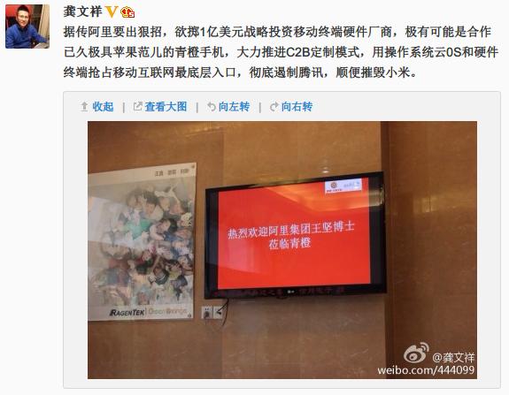 今天下午,电商大V@龚文祥在微博爆料称:“据传阿里要出狠招,欲掷1亿美元战略投资移动终端硬件厂商,极有可能是合作已久极具苹果范儿的青橙手机,大力推进C2B定制模式,用操作系统云0S和硬件终端抢占移动互联网最底层入口,彻底遏制腾讯,顺便摧毁小米。”
