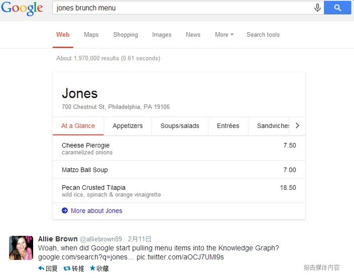 Google所呈现的菜谱采用卡片式设计,点击不同的Tab可以切换头盘、配菜、餐后甜点等不同分类。其实早在上个月11号,就有用户在Twitter上晒出了截图,而Google今天才正式在Google+发布消息予以承认。目前尚不清楚菜单数据来自哪里,有媒体称主要来自一家叫AllMenus.com的网站,但Google官方的说法则是“来自一家不知名的数据合作伙伴”。眼下该功能支持的餐厅数量有限,而且只能通过“show me the menu for XXX”的句式访问。不过奇怪的是,在Twitter曝光的图片显然并没使用以上句式,由于美国以外的用户暂时无法访问该功能,所以我也没法亲自验证了。