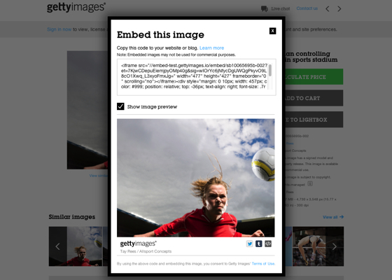在图片免费后,Getty Images的收入模式是,一旦图片嵌入到其它网页中,Getty Images就可以更好地控制他们,通过加入广告或者收集用户数据都可以创造收入。Youtube 视频就可以自由接入到各种网页,而Google可以在这些位置通过显示广告等方式赚钱,这种模式给Getty Images 树立了标杆。Getty Images将提供可用于分享到Twitter、Tumblr以及Wordpress等社交媒体的代码,最大程度地鼓励用户的分享行为。