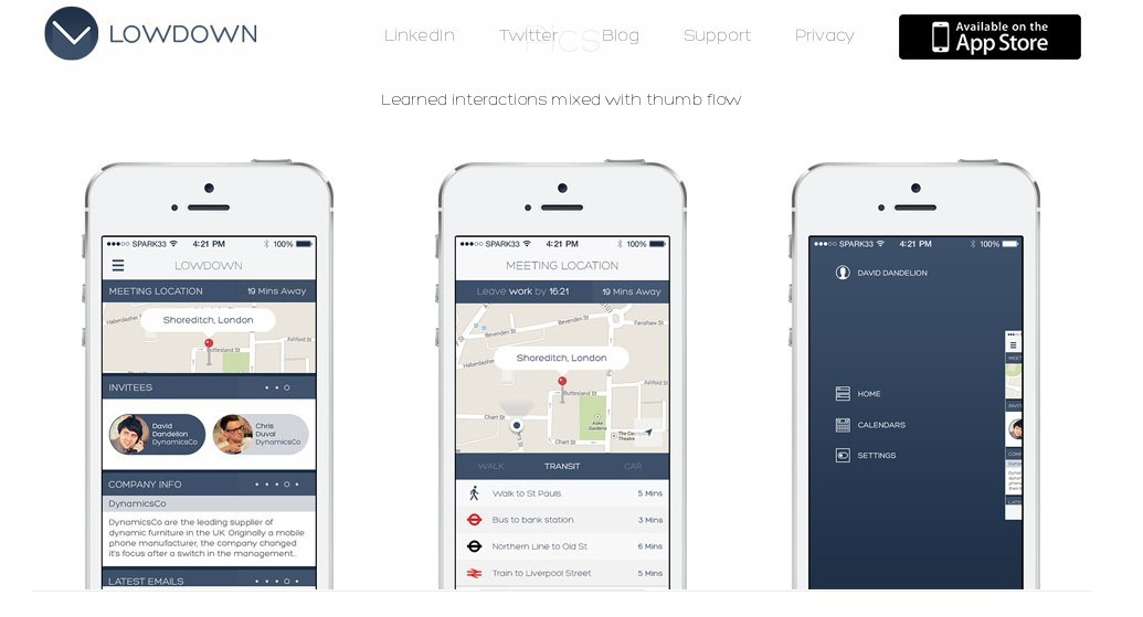 “咦,你还用Lowdown 啊?这个很新耶,我也试过,它的特点是能够帮助你记录会议的时间、地点、参与人员、会议主题、参会公司的介绍,会议主题等等全面而细致的信息,有推送和链接社交网络的功能,还能规划路线,直接通过邮件回复。话说,你的工作跟测试新的产品相关吗?”