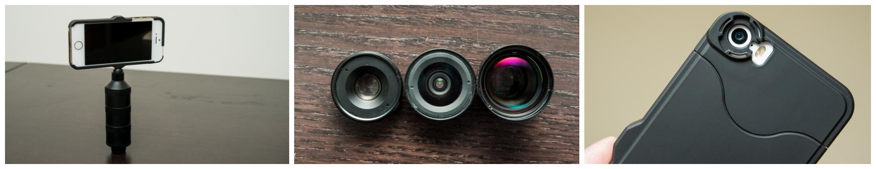 另一款外置镜头叫iPro lens(下图),一整套设备包括iPhone壳,长焦,微距和广角镜头还有一个稳定架(代替三脚架)。这款镜头较Olloclip四合一镜头来说,不会存在无法锁屏的问题,它的缺点体现在价格上:一套229美元。