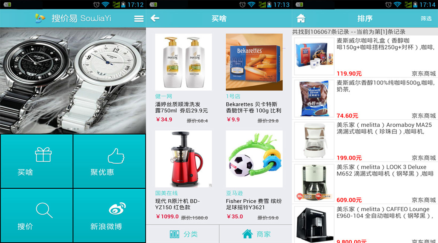 而近期搜价易更新了其安卓客户端(同时也有iOS客户端以及微信、易信公共账号),新版客户端在设计上中规中矩,操作流畅,功能简单明了,包括商品导购服务“买啥”、优惠活动汇总服务“聚优惠”,以及搜索功能,能够为用户提供全面的购买服务。在“买啥”里,还可以看到众多的商品以及商城分类。用户也可以使用搜索功能,直接寻找自己想要的商品。在选择了相应的产品之后,APP会自动跳转至相应电商的页面来完成支付购买。