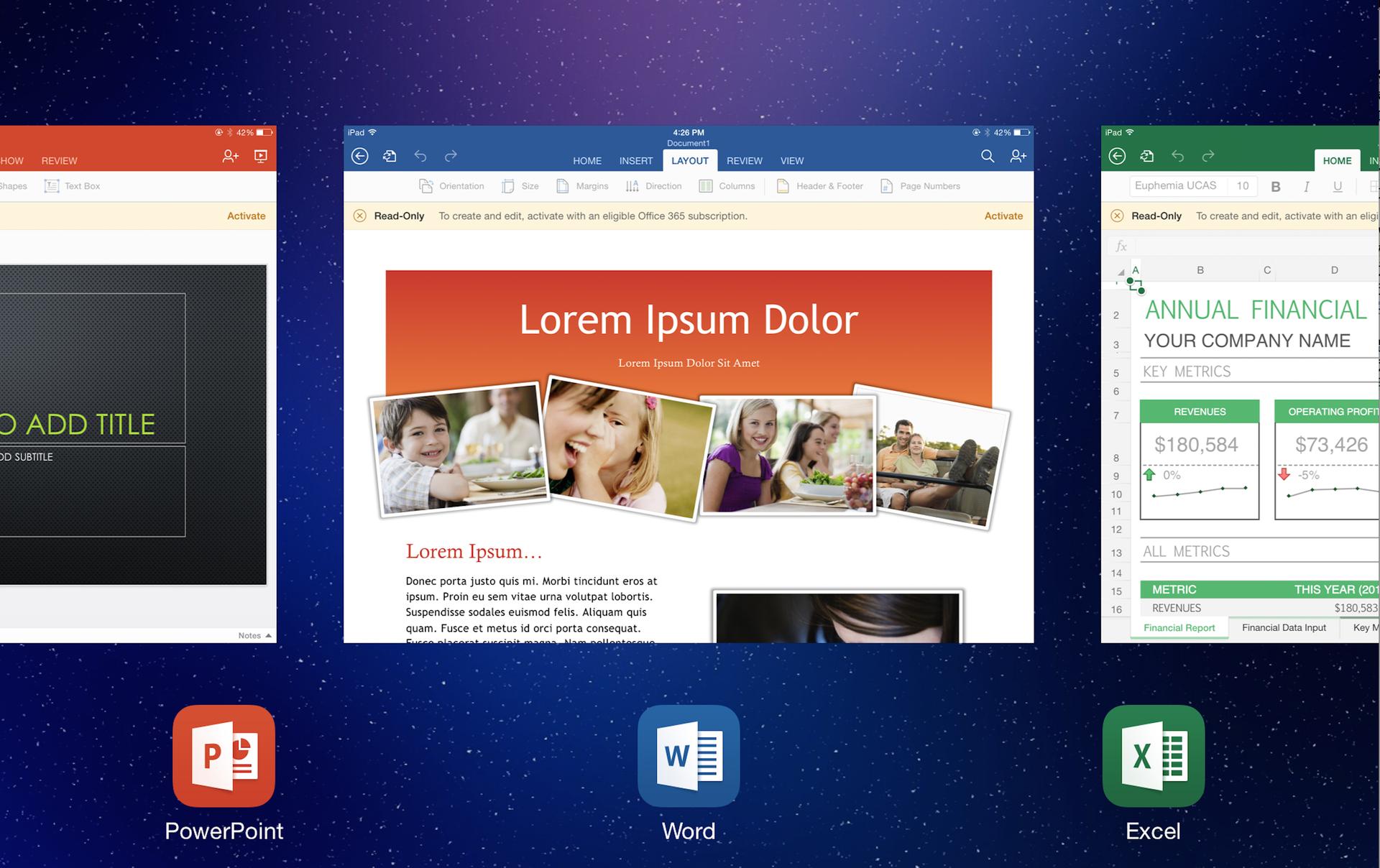 今天,微软终于发布了 iPad 版 Office 套装,Office 负责人 Julia White 也在今早举行于旧金山的发布会上介绍了 iPad 版 Word、Excel 和 PowerPoint,没错,这是三个经过精心优化的独立应用。