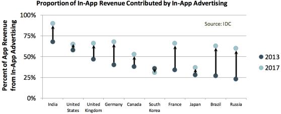 而就现在的研究数据看,移动应用的广告营收总额将在2017年超越PC。IDC的数据预测,截至2017,每个主要移动市场的广告营收占其移动应用总营收的比例都将大幅增长,美国市场增长率将达到60%。除日韩外,其他市场例如德国,法国,巴西等国的比例都将突破50%。