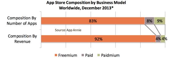 在Google Play和苹果应用商店中,分别排名前1000的应用里有83%的应用使用免费增值模式,而这2000个应用总营收的92%来自免费增值。