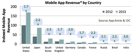 美国市场依然是移动应用营收的最大贡献者,去年的营业额增长1.7倍。虽然日本,韩国和印度的增幅分别高达2.2,2.3和3倍,但由于基数小,营收绝对值上仍无法和美国媲美。但印度的移动应用营收在2017年有望达到2013年870%。